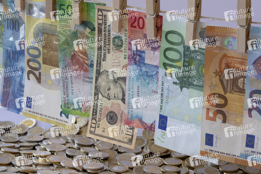 EURO, Schweizer Franken und Dollar Banknoten an einer Wäscheleine und Münzen