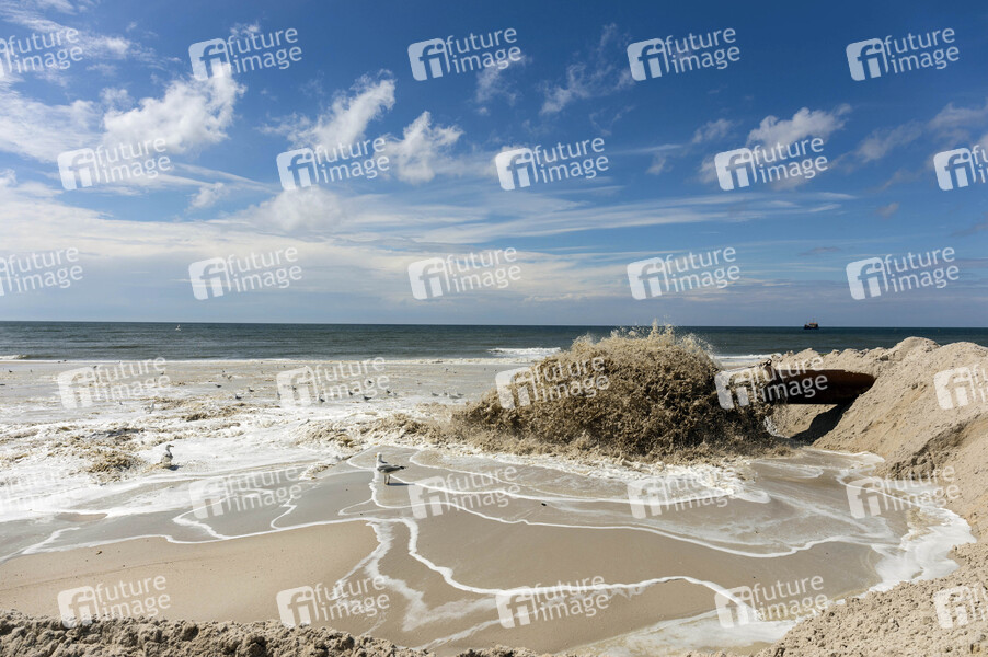 Sandaufspülung, Sylt, Nordsee, Naturgewalt, Schutz der Küstenlinie, Tourismus, Insel, Strand, Küstenschutz, Schaffung von Vordünen, Vorstrand-Aufspülungen, Brandungszone, Sandaufspülungen, Spülschiff, Spülleitung, Hopperbagger, SpülfeldSymbolbild, Themenbild