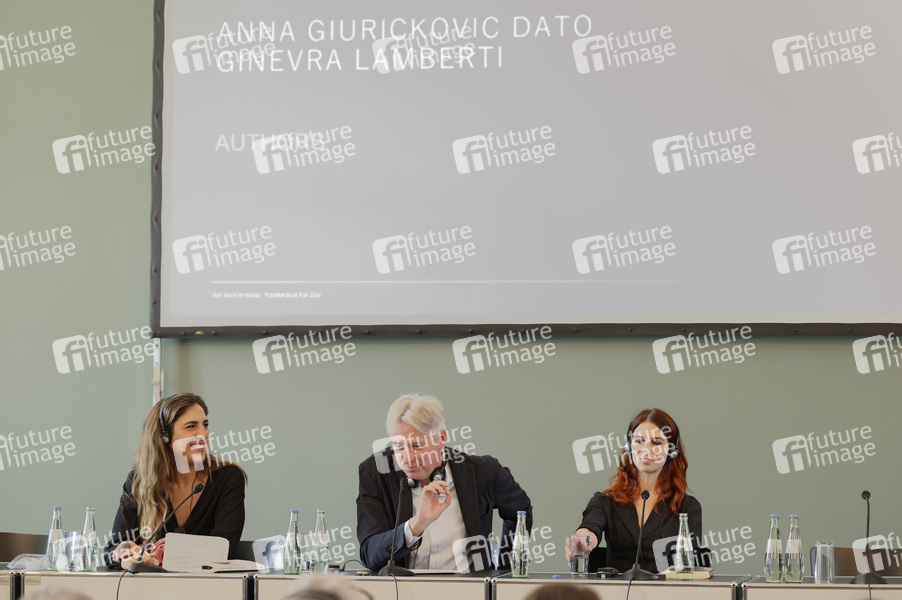 Anna Giurickovic Dato, Juergen Boos und Ginevra Lamberti bei der Pressekonferenz zur Vorstellung des Programms des Ehrengastes Italien für die Frankfurter Buchmesse 2024 im Literaturhaus Schöne Aussicht 2. Frankfurt am Main, 28.05.2024