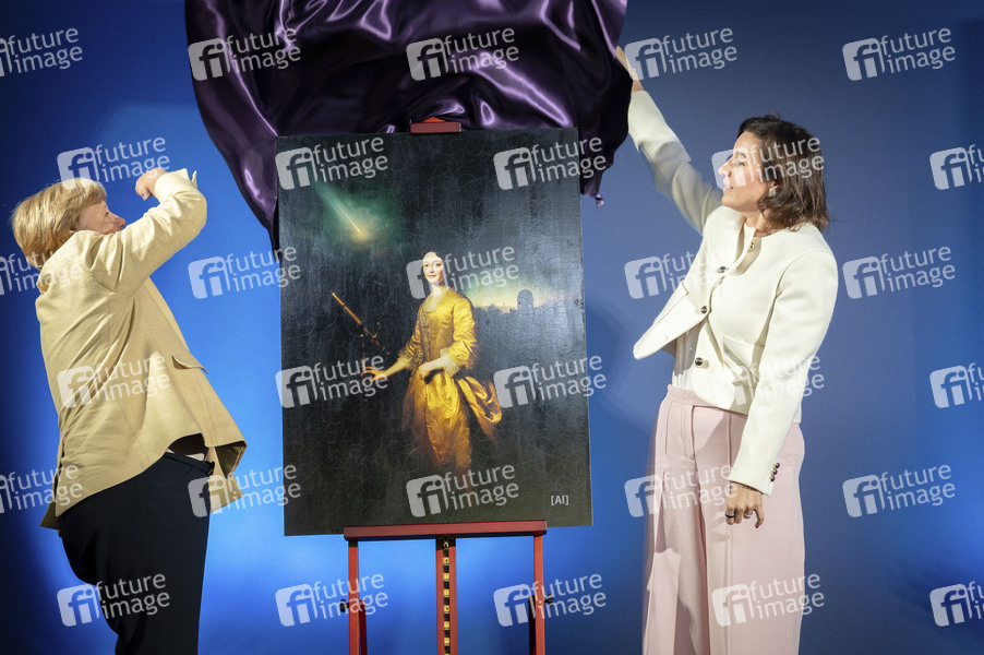 Angela Merkel und Dorothee Bär enthüllen das KI-generierte Bild von Maria Winkelmann-Kirch bei der Ausstellungseröffnung 'Unsichtbare Wissenschaftlerinnen - Versäumte Bilder' im Bundesministerium für Forschung, Technologie und Raumfahrt. Berlin, 16.09.2025