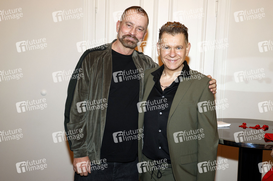 Ulf Leo Sommer und Peter Plate bei der Spendenscheckübergabe zum Welt-Aids-Tag 2024 im Theater des Westens. Berlin, 30.11.2024