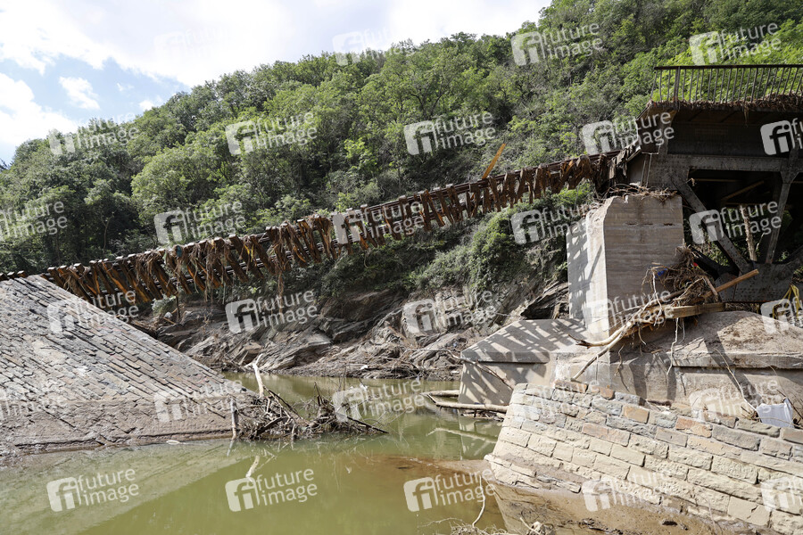 Nach dem Jahrhunderthochwasser in der Eifel durch heftige Regenfälle und Dauerregen mit Überschwemmungen und Überflutungen haben die Aufräumarbeiten im Ahrtal große Fortschritte gemacht. Einheiten von Polizei, THW, Bundeswehr und Feuerwehr mitsamt vielen freiwilligen Helfern haben Straßen geräumt, Schutt und Schlamm entfernt und die Menschen versorgt. Der Wiederaufbau wird trotzdem Jahre dauern. Im Bild Flutschäden an einer Eisenbahnbrücke nahe der Ortschaft Rech, in der die Flut viele Häuser zerstörte, 30.07.2021