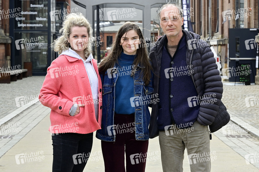Cornelia Gröschel, Emilie Neumeister und Martin Brambach beim Fototermin am Set des ARD-Krimis 'Tatort: Schwesternliebe' im Dresdner Kraftwerk Mitte. Dresden, 25.04.2024