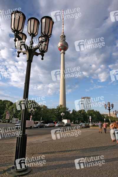 Alexanderplatz, mit 368 m das höchste Bauwerk Deutschlands, die Architektur geht auf eine Idee von Hermann Henselmann und Jörg Streitparth zurück, erbaut 1965-1969, die wichtigste Architekten waren Fritz Dieter und Günter Franke und Werner Ahrend, Länge der Antenne: 118 m, Durchmesser des Telecafés: 29 m, die Kugel des Fernsehturms wurde im Vorfeld der Fußball-Weltmeisterschaft 2006 mit einer Folie in Form eines Fußballs beklebt, Teile der WM-Beklebung sind auf diesem Foto zu sehen