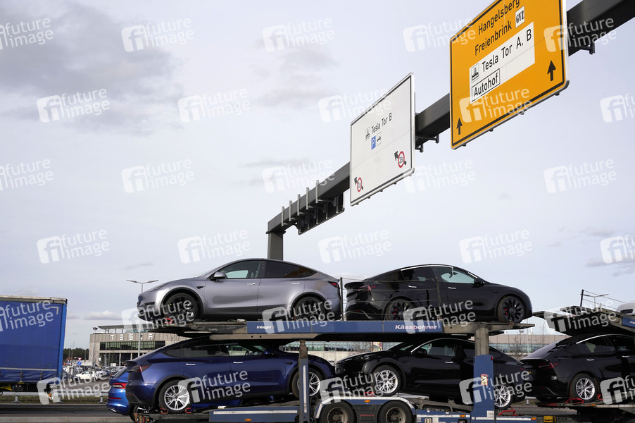 Ein Autotransporter mit fabrikneuen Tesla Pkw fährt unter Schilderbrücke an Gigafactory vorbei. Die Erweiterungspläne für die Fabrik des Elektroautobauers Tesla in Grünheide (Oder-Spree) bei Berlin sind bei einer Einwohnerbefragung mehrheitlich auf Ablehnung gestoßen. Doch das Votum ist letztlich nicht bindend. Tesla will neben dem 300 Hektar großen Werksgelände einen Güterbahnhof, Lagerhallen und einen Betriebskindergarten errichten. Dafür müssten aber rund 100 Hektar Wald gerodet werden. Das ist umstritten. Es gibt Befürworter der Pläne, aber auch Ablehnung einer Tesla-Erweiterung (Quelle: rbb24). Grünheide, 23.02.2024