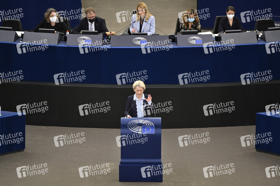 Ursula von der Leyen bei einer Plenartagung zu den jüngsten Entwicklungen des Krieges gegen die Ukraine und der EU-Sanktionen gegen Russland und deren Umsetzung im Plenarsaal des Europäischen Parlaments. Straßburg, 06.04.2022