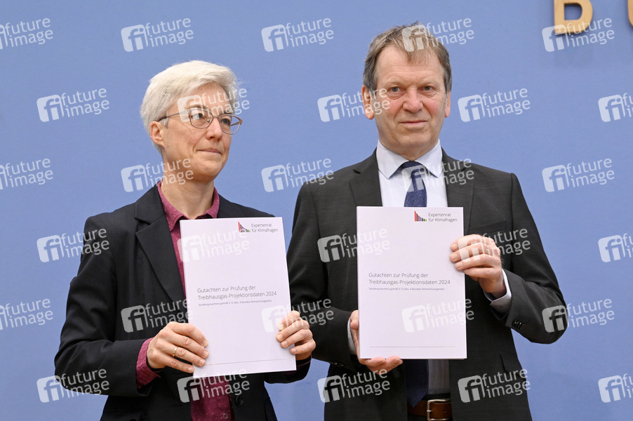 Brigitte Knopf und Hans-Martin Henning bei der Bundespressekonferenz Sondergutachten zur Prüfung der Treibhausgas-Projektionsdaten 2024 im Haus der Bundespressekonferenz. Berlin, 03.06.2024