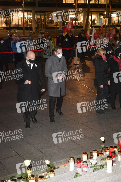 Michael Müller beim stillen Gedenken an die Opfer des islamisitischen Terroranschlags vom 19.12.2017 vor niedergelegten Kränzen mit 12-maligem Glockenschlag um 20.02 Uhr am Mahnmal 'Der Riss' auf dem Breitscheidplatz. Berlin, 19.12.2020