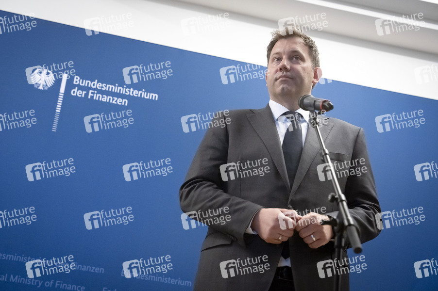 Lars Klingbeil beim Pressestatement zum Treffen des Bundesfinanzministers und des Exekutiv-Vizepräsidenten der Europäischen Kommission für Wohlstand- und Industriestrategie im Bundesfinanzministerium. Berlin, 26.05.2025