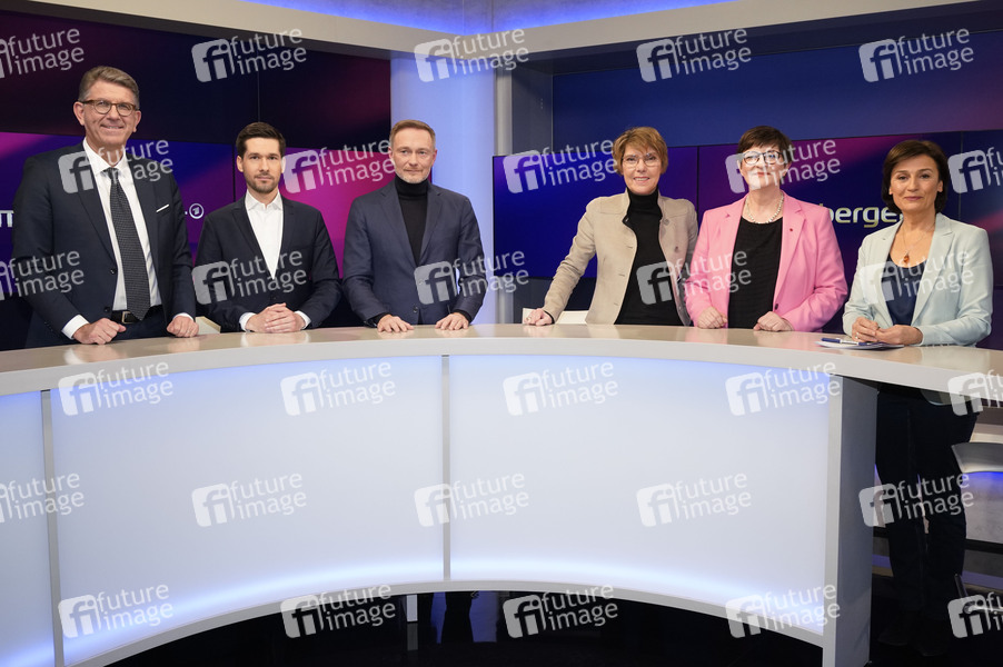 Wolfram Weimer, Vassili Golod, Christian Lindner, Bettina Böttinger, Saskia Esken und Sandra Maischberger in der ARD-Talkshow 'maischberger' im Studio Berlin Adlershof. Berlin, 18.02.2025