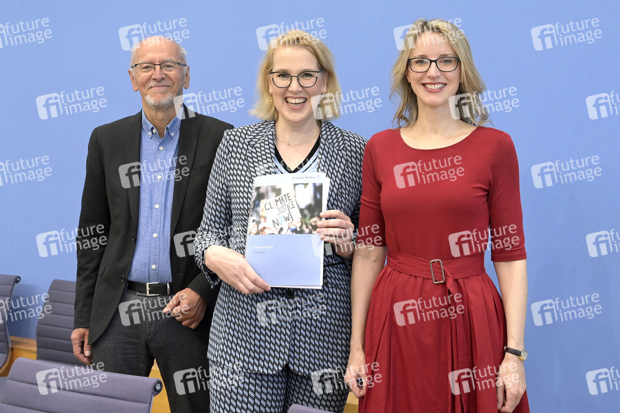 Armin Grunwald, Kerstin Schlögl-Flierl und Alena Buyx bei der Bundespressekonferenz zur Stellungnahme 'Klimagerechtigkeit' des Deutschen Ethikrats im Haus der Bundespressekonferenz. Berlin, 13.03.2024