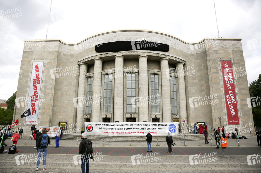 Auf dem Rosa-Luxemburg Platz haben sich 50 Demonstranten versammelt, um gegen Verschwörungstheoretiker zu demonstrieren. Die Polizei hat den Platz abgeriegelt und kontroliert jeden, der ihn betreten will. Am Samstag sind rund um den Rosa-Luxemburg-Platz mehrere 'Hygienedemos' und Gegenproteste geplant. Am Alexanderplatz sollen ab 14 Uhr insgesamt zehn Kundgebungen starten. Berlin, 16.05.2020