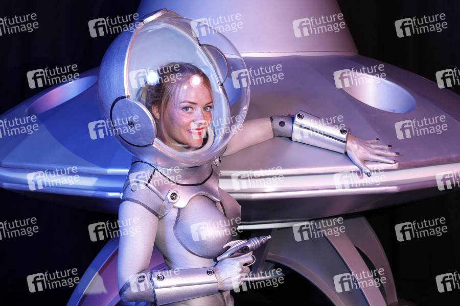 GEEK ART - Bodypainting and Transformaking: UFO Photoshooting mit Daniela Buchholz als Space Girl mit einem UFO im Filmwelt Center. Bad Münder, 13.10.2021 - Ein Projekt des Fotografen Tschiponnique Skupin und des Bodypainters und Transformakers Enrico Lein