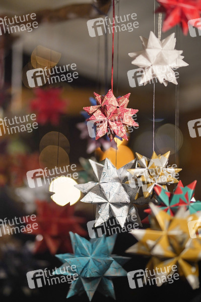 Handgefertigte Weihnachtssterne - Der Alt-Rixdorfer Weihnachtsmarkt am Richardplatz im Berliner Bezirk Neukölln bietet eine besondere Atmosphäre: Nur karitative und gemeinnützige Organisationen präsentieren ihre Waren im besonderen Ambiente des warmen Lichts aus Öllampen in der historischen Kulisse des alten Dorfes Rixdorf im 48. Jahr. Berlin, 02.12.2022