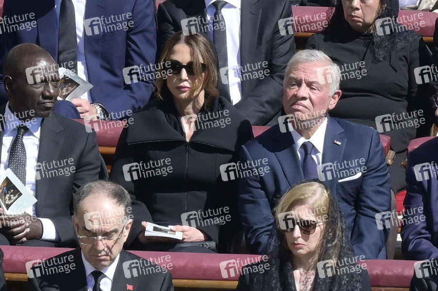 Rania von Jordanien und König Abdullah II. bin al-Hussein bei der Trauermesse für den verstorbenen Papst Franziskus auf dem Petersplatz. Vatikanstadt, 26.04.2025