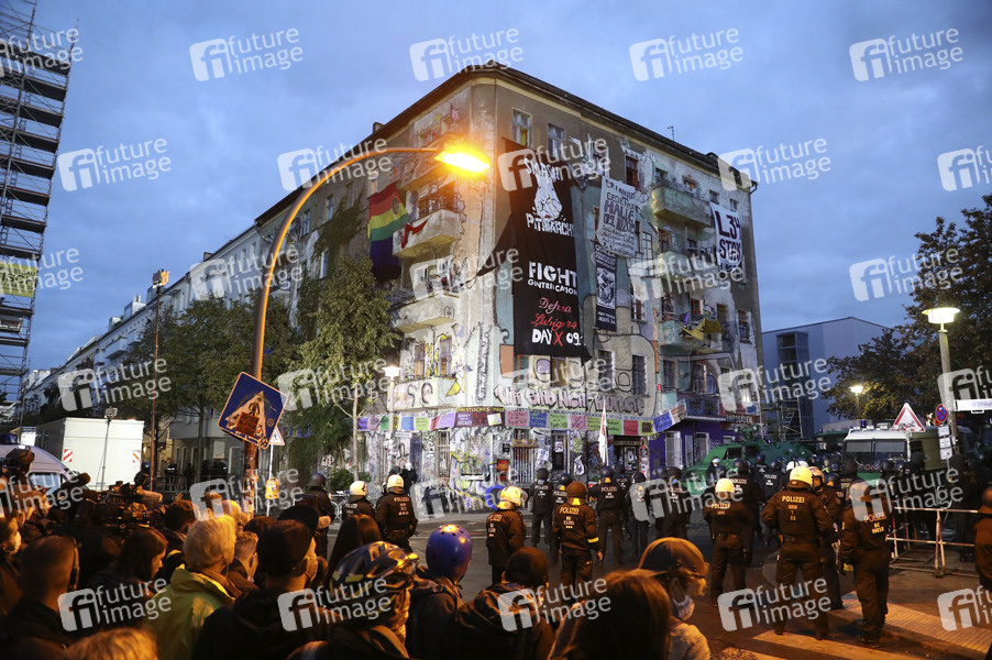 Die Berliner Polizei hat das Wohnprojekt Liebig34 in Berlin-Friedrichshain geräumt. Polizisten verschafften sich Zugang zu dem Haus führten nach und nach die Bewohnerinnen heraus. Die Berliner Polizei war mit 1500 Beamten im Einsatz. Vor dem Haus kam es zu Demonstrationen. Berlin, 09.10.2020