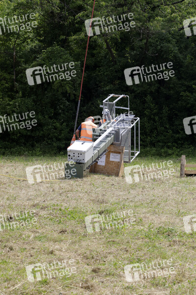 Signalaufnahme beim Fototermin 'Helikopter fliegt Signalmaste für das neue Elektronische Stellwerk in Bonn-Beuel ein'. Es beginnt letzte große Bauphase vor der Generalsanierung der rechten Rheinstrecke im Jahr 2026. Mit Hilfe eines Helikopters werden knapp 50 Signalmaste für das neue ESTW Bonn-Beuel eingeflogen. Bonn, 14.06.2025