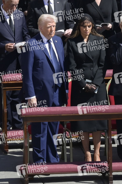 Donald Trump mit Ehefau Melania Trump bei der Trauermesse für den verstorbenen Papst Franziskus auf dem Petersplatz. Vatikanstadt, 26.04.2025