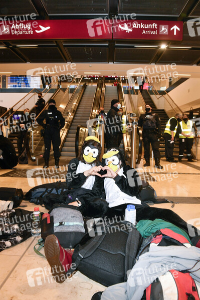 Klimaaktivisten der Aktionsgruppe 'Am Boden bleiben' protestieren gegen die Eröffnung des Flughafens Berlin-Brandenburg (BER). Schönefeld, 31.10.2020