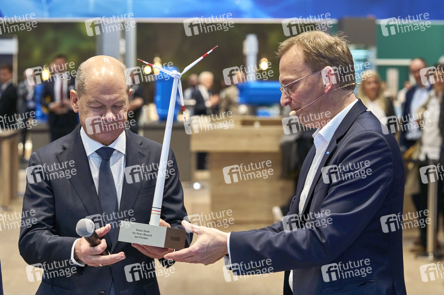 Olaf Scholz und Andreas Evertz beim Eröffnungsrundgang Stand der Firma Flender auf der Hannover Messe 2025 auf dem Messegelände. Hannover, 31.03.2025