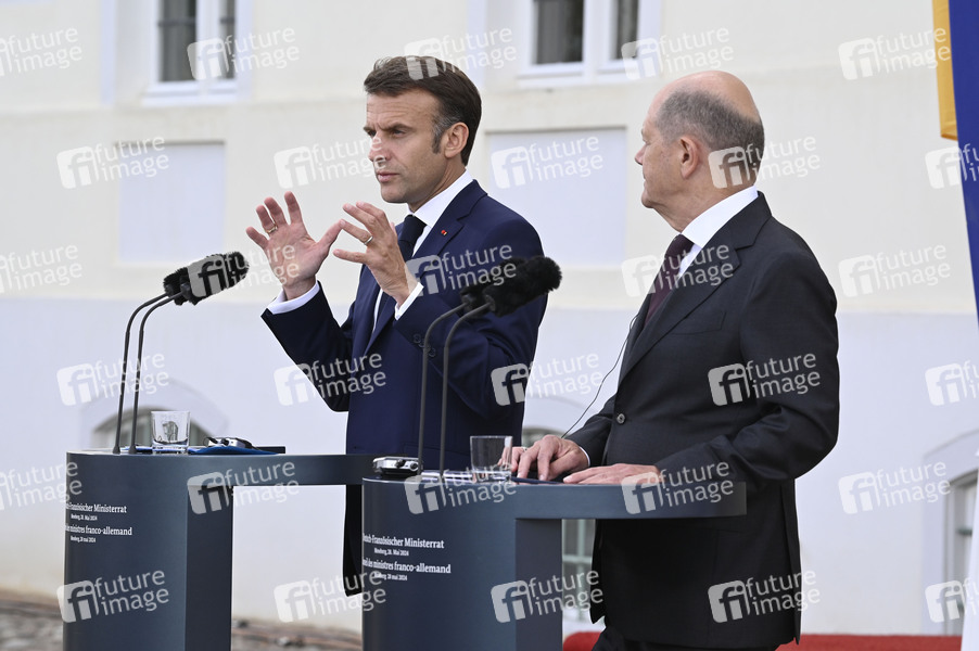 Emmanuel Macron und Olaf Scholz beim Treffen des Deutsch-Französischen Ministerrats im Gästehaus der Bundesregierung Schloss Meseberg. Meseberg, 28.05.2024