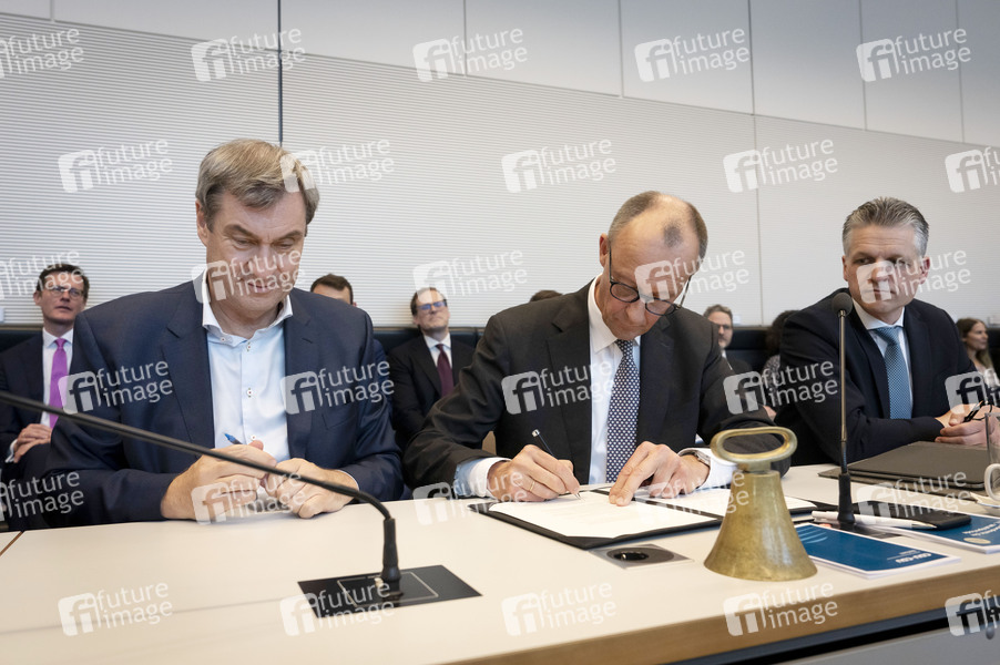 Markus Söder, Friedrich Merz und Thorsten Frei bei der konstituierenden Fraktionssitzung mit Unterzeichnung des Vertrags über die Fortführung der Fraktionsgemeinschaft von CDU und CSU im Reichstagsgebäude. Berlin, 25.02.2025