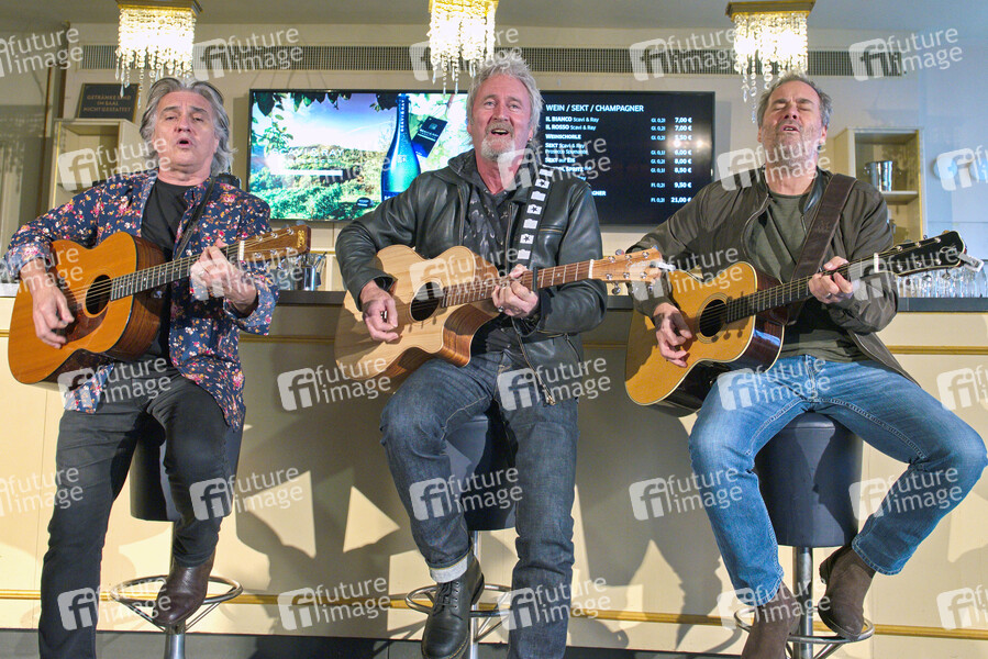 Peter Howarth (The Hollies), Pete Lincoln (The Sweet, Sailor) und Mick Wilson (10cc) von Frontm3n beim Fototermin zum Medientag mit Frontm3n im Admiralspalast. Berlin, 13.12.2019