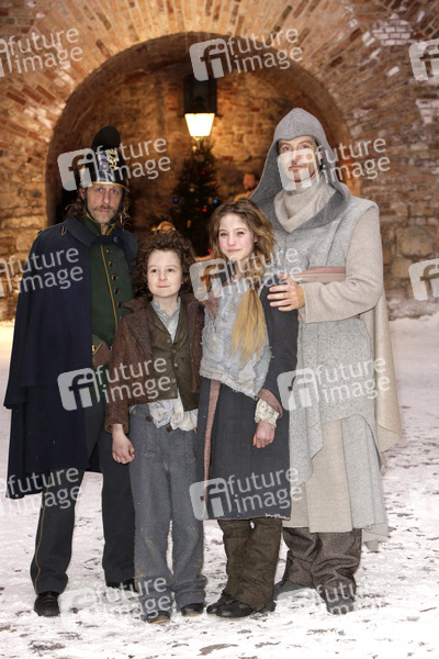 Oliver Korittke, Maximilian Ehrenreich, Lea Mueller und Joerg Hartmann beim Fototermin am Set des Fernsehfilms 'Das Mädchen mit den Schwefelhölzern' aus der ARD-Märchenreihe 'Sechs auf einen Streich' in der Zitadelle Spandau. Berlin, 18.03.2013