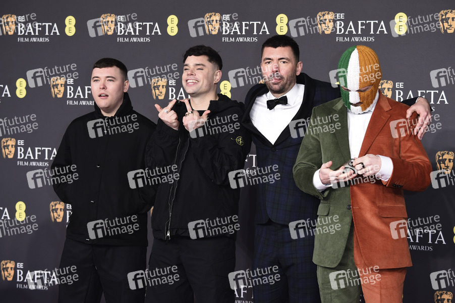 Moglai Bap, Mo Chara, Rich Peppiatt und Dj Provai of Kneecap bei der Verleihung der BAFTA Film Awards 2025 / 78th British Academy Film Awards in der Royal Festival Hall. London, 16.02.2025