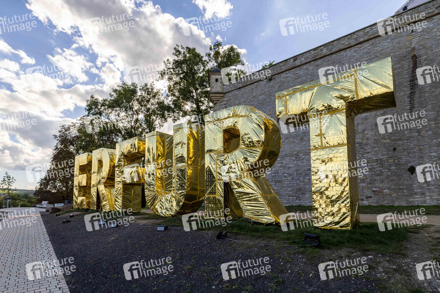 Erfurt Schriftzug auf dem Petersberg bei dem Vorbereitungen zum Tag der Deutschen Einheit unter dem Motto 'Zusammen wachsen'. Erfurt, 30.09.2022