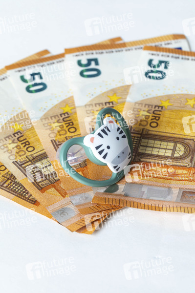 Familienbeihilfe, staatliche Leistungen an Erziehungsberechtigte, Versorgung, Grundversorgung, Grundsicherung, Unterstützung, Eltern, Kinder, Kinderzulage, Kindergeldzuschlag, Eikommen, Kinderbonus, Kindergeldanspruch, Kindergarantiebetrag, Geld, Banknoten, Geldscheine, Vermögen, Euro, €, Geldschein, Nuckel, Schnuller, Themenbild, Symbolbild