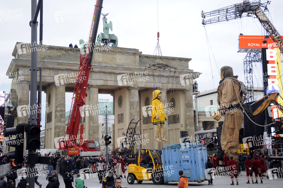Riesen-Marionetten kommen zum Brandenburger Tor am Tag der Deutschen Einheit in Berlin