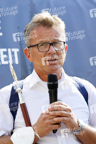 Klaus Koltermann bei einer Kundgebung auf dem Börsenplatz, bei der Gläubige aus dem Erzbistum Köln und Aktivisten der Bewegung Maria 2.0 das Verhalten der Kirche und Erzbischof Rainer Maria Kardinal Woelki bei der Aufarbeitung des Missbrauchskandal kritisieren. Am Nachmittag trifft auch eine Pilgergruppe von Pfarrer Klaus Koltermann aus Dormagen Nievenheim mit 60 Christen nach 40 Km Fußmarsch unter dme Motto 'Aufbruch nach Köln' auf dem Börsenplatz ein. Koltermann hat sich als einziger Pfarrer in Deutschland für den Rücktritt von Kardinal Woelki ausgesprochen. Köln, 12.06.2021