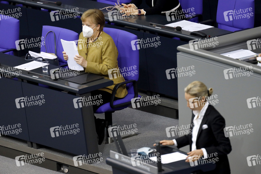 Angela Merkel und Alice Weidel in der 209. Sitzung des Deutschen Bundestages im Reichstagsgebäude. Berlin, 11.02.2021