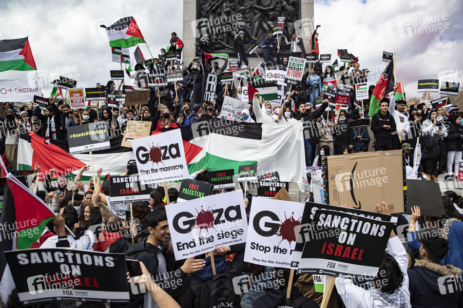 Tausende Menschen bei einem Protestmarsch, organisiert von pro-palästinensischen Organisationen. Viele Teilnehmer trugen Palästina-Fahnen und 'Free Palestine'-Banner. Ein Sprecher der Gruppe forderte die britische Regierung auf, ihre militärische, diplomatische und finanzielle Unterstützung für Israel umgehend einzustellen. London, 21.03.2021