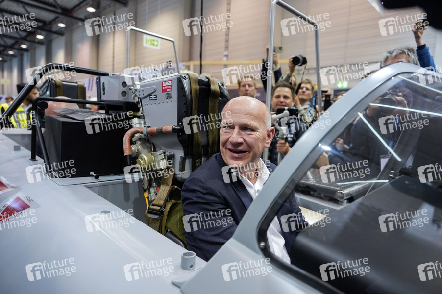 Kai Wegner im Simulator vom Kampfflugzeug Tornado beim Rundgang vor der Eröffnung der ILA Berlin auf dem ILA-Gelände am Flughafen BER Berlin-Brandenburg. Berlin, 03.06.2024