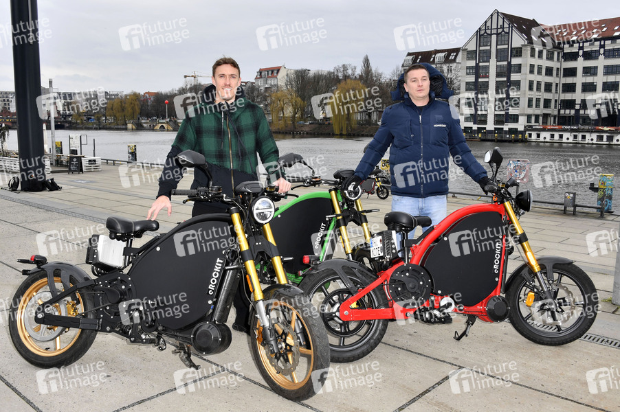 Max Kruse und Aaron Troschke beim Fototermin zur Eröffnung der Zweiradsaison 2021 mit eROCKIT an der East Side Gallery. Berlin, 11.03.2021