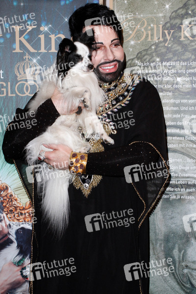 Hund Billy King und Harald Gloeoeckler bei der Buchvorstellung 'Billy King - mein Leben mit Harald Glööckler'. Berlin, 28.02.2013