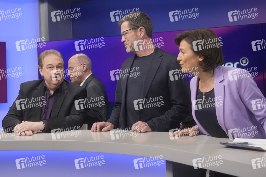 Oliver Kalkofe, Gregor Gysi, Karl-Theodor zu Guttenberg und Sandra Maischberger in der ARD-Talkshow 'maischberger' im Studio Berlin Adlershof. Berlin, 11.03.2025