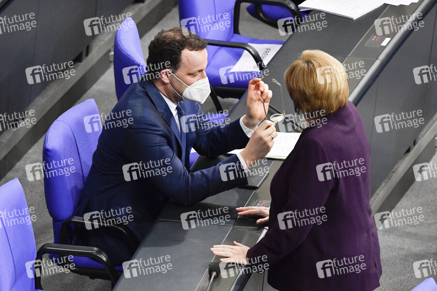 Jens Spahn und Angela Merkel in der 205. Sitzung des Deutschen Bundestages im Reichstagsgebäude. Berlin, 27.01.2021
