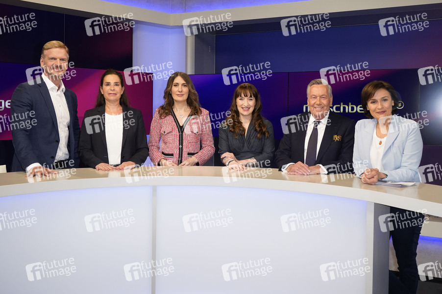 Gordon Repinski, Dagmar Rosenfeld, Anja Kohl, Heidi Reichinnek, Roland Kaiser und Sandra Maischberger in der ARD-Talkshow 'maischberger' im Studio Berlin Adlershof. Berlin, 08.04.2025