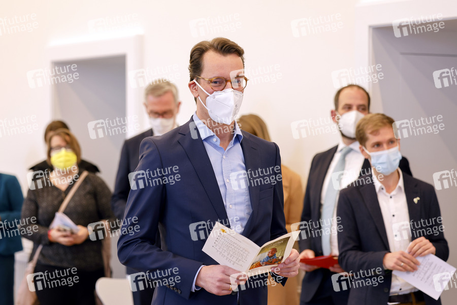 Politiker, NRW-Ministerpräsident, Ministerpräsident des Landes Nordrhein-Westfalen, CDU, Fototermin, Sternsinger, Sternsingen 2022, Kirche, Glaube, Segen, Erzbistum Köln, Dreikönigssingen, Heilige Drei Könige, Caspar, Melchior, Balthasar, CMB, Diözese Aachen, Glaube, römisch-katholische Kirche, Dreikönigstag, Brauch, Brauchtum, Tradition, Carol Singers, Masken, Corona, Maskenpflicht, Schutz, Gesang, Gesangsheft