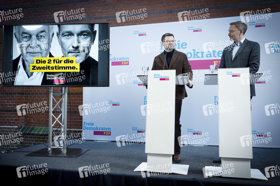 Marco Buschmann und Christian Lindner bei der Pressekonferenz nach den Gremiensitzungen der FDP im Hans-Dietrich-Genscher-Haus. Berlin, 17.02.2025