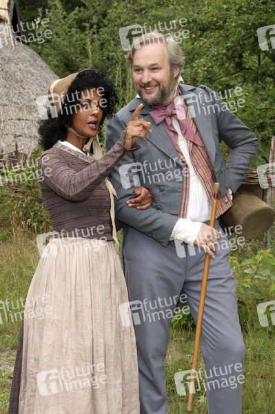 Dennenesch Zoude und Stephan Grossmann beim Pressefototermin am Set des Märchenfilms 'Das Märchen vom goldenen Taler' für die ARD-Märchenreihe 'Sechs auf einen Streich' im Museumsdorf Düppel. Berlin, 08.07.2020