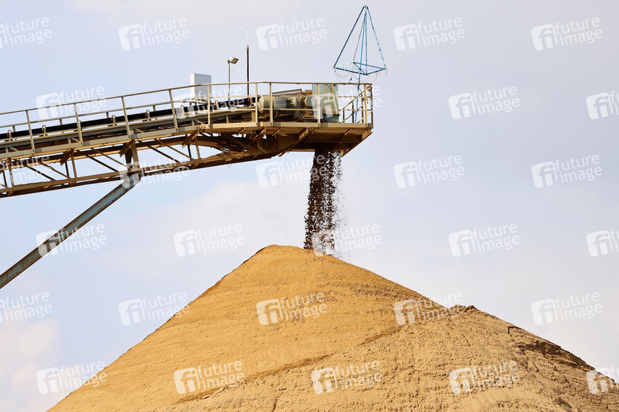 Aushub, Abbau, Sand, Sandgrube, Baustoff, Baustoffe, Sandwerk, Sandberg, Sandberge, Sediment, Mineral, Mineralien, Mineralkörner, Kieswerk, Kiesgrube, Quarzsand, Quarzsandwerk, Quarzkörner, Förderband, Sandsteinbruch, Körnung, Sand kaufen, Sandhandel, Bauindustrie, Rohstoff, Rohstoffe, Symbolbild, Symbolfoto