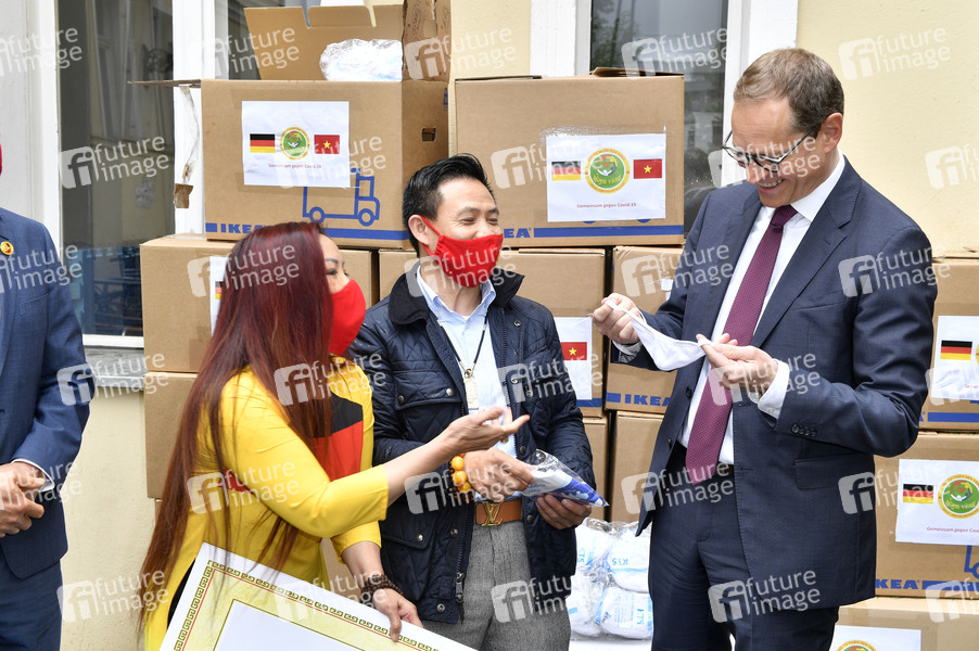 Duong Thi Bich Ngoc, Tran Manh Hung und Michael Müller bei der Entgegennahme der Spende von Masken und Handschuhen des vietnamesischen Wohltätigkeitsvereins Hoi tu thien Sen Vang Berlin in Pankow. Berlin, 25.05.2020