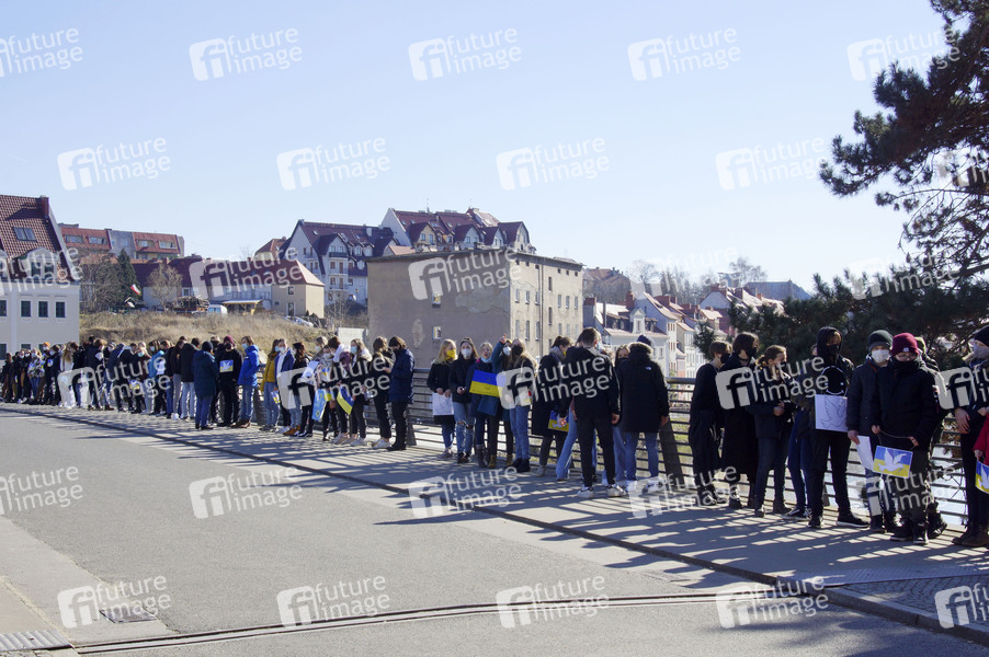 Initiiert vom Görlitzer Augustum-Annen-Gymnasium fanden sich ca. 1.000 Menschen zu einer grenzüberschreitenden Menschen-Kette zusammen, ausgehend von der Altstadtbrücke in beide Richtungen nach Zgorzelec und Görlitz. Mit dabei waren der Görlitzer Oberbürgermeister Octavian Ursu, sein Zgorzelecer Amtskollege Rafal Gronicz und Marcin Król, der Konsul der Republik Polen in Berlin. Görlitz, 09.03.2022