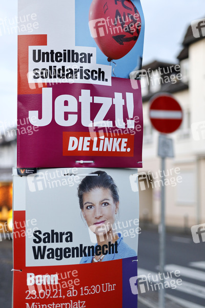 Wahlplakate der Partei Die Linke mit der Aufschrift 'Unteilbar solidarisch. Jetzt! Die Linke.' und dem Konterfei von Sahra Wagenknecht. Laut neuester Umfragen gewinnt die SPD weiter Prozentpunkte hinzu, wodurch ein grün-rot-rotes Bündnis eine Mehrheit im Bundestag hätte. Bonn, 01.09.2021