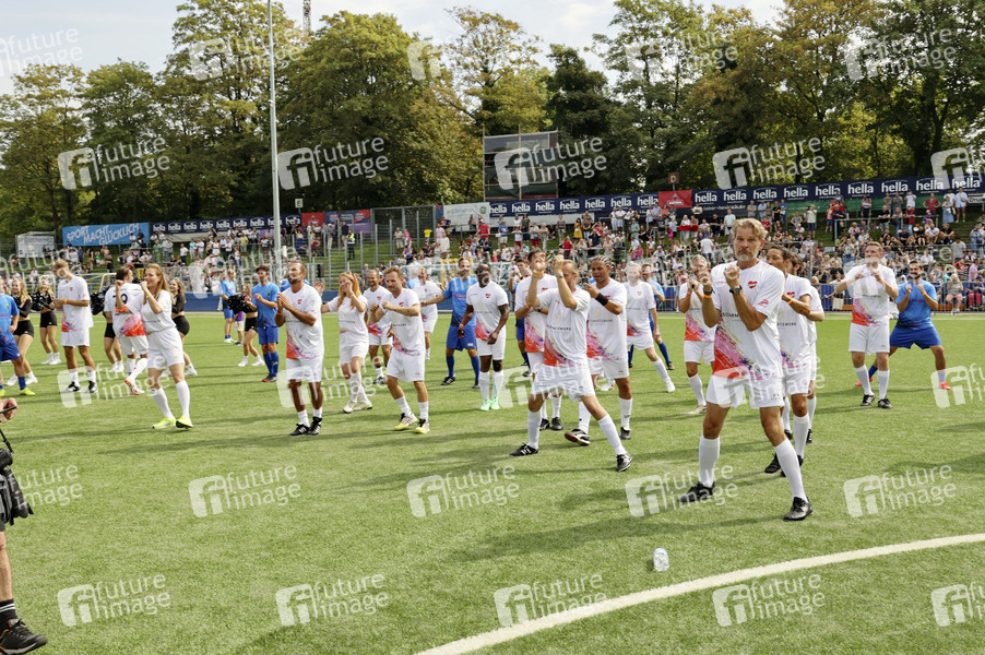Die Hamburg Allstars beim Aufwärmen beim Benefiz-Fußballspiel 'Kicken mit Herz' 2024 zu Gunsten des Herzzentrums des UKE im Stadion des SC Victoria. Hamburg, 08.09.2024