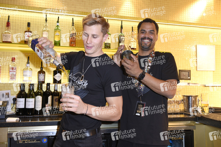 Lukas Sauer und Patrice Bouedibela kellnern im Rahmen der Pinktober Charity-Aktion zugunsten der Organisation Brustkrebs Deutschland e.V. im Hard Rock Cafe. Berlin, 27.10.2019